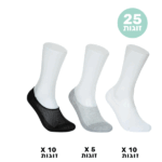המארז מכיל: 10 זוגות בצבע לבן + 10 זוגות בצבע שחור + 5 זוגות בצבע אפור מלאנג’.