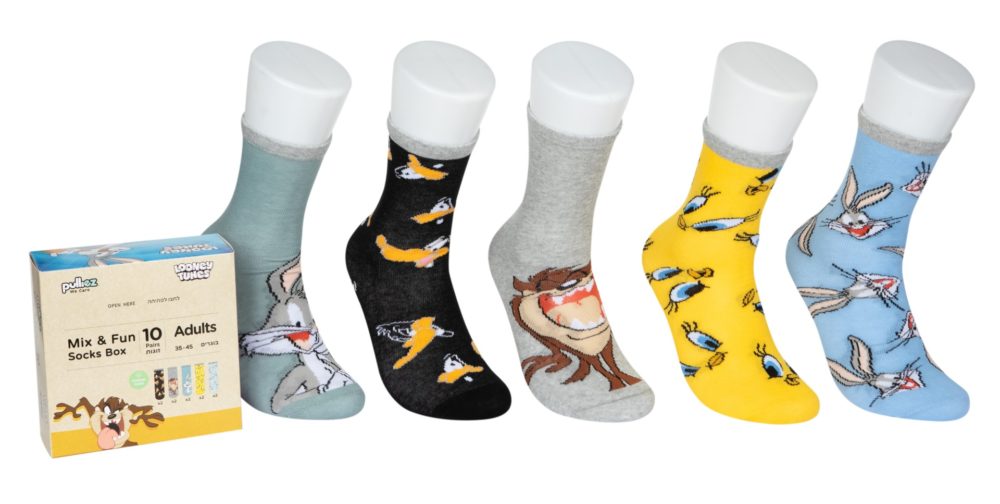 קופסת 10 זוגות גרבי כותנה בוגרים, דגם לוני טונס