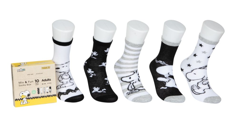 קופסה עם 10 זוגות גרבי כותנה מעוצבים לבוגרים, דגם סנופי.